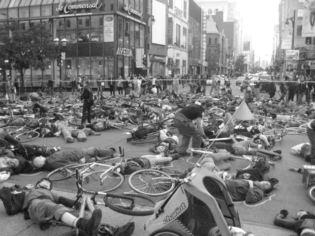 Die-in dénonçant la mortalité des cyclistes à Montréal. 2008.