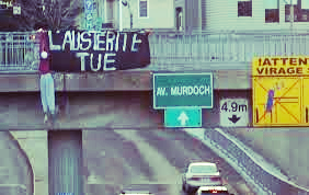 Trouver un lieu public et très fréquenté en hauteur (pont, viaduc, balcon d’hotel de ville?). Confectionner une bannière de tissu avec un slogan puissant et clair inscrit à la peinture acrylique. Y inscrire le site internet de la campagne : www.jaiunehistoire.com. Lancer la bannière en l’attachant solidement, peu avant que notre communauté s’éveille. N’oubliez pas d’envoyer une belle photo au Regroupement!